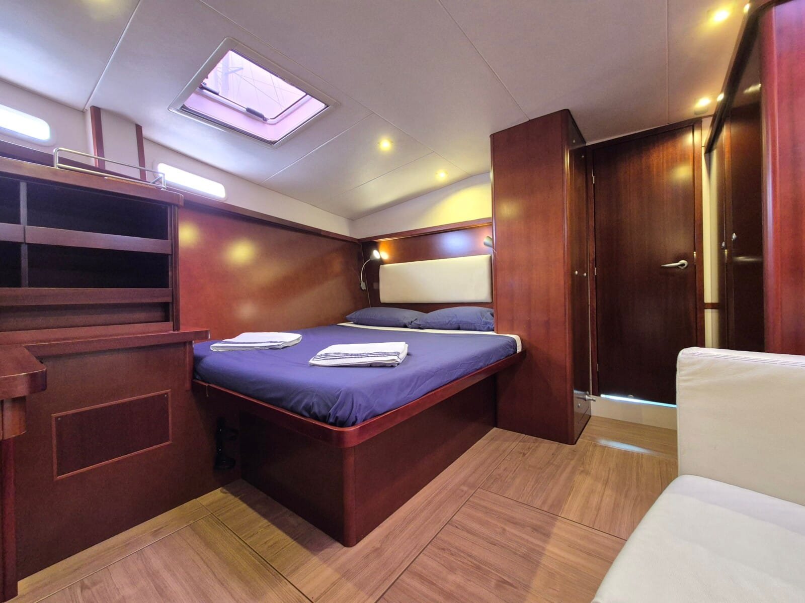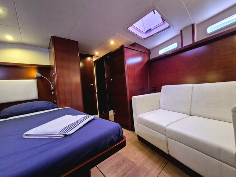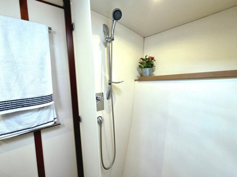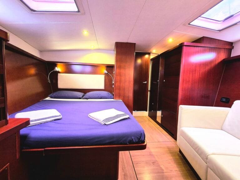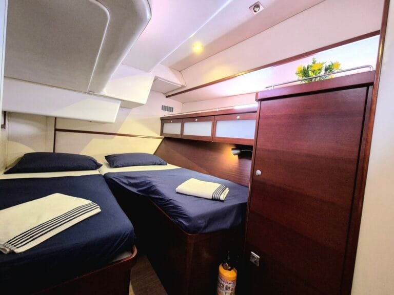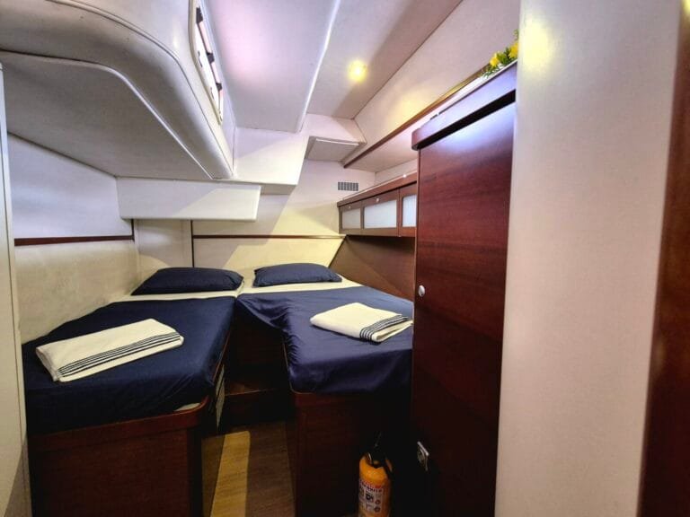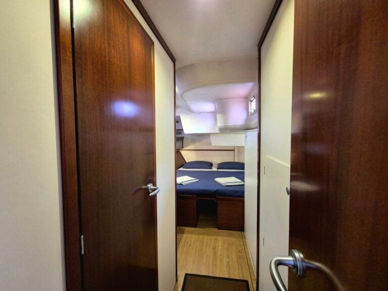 3 dvoulůžkové kajuty pro hosty – každá s vlastním sociálním zařízením Prostorný salón – posezení, jídelní kout Venkovní kokpit se stíněním – ideální pro stolování i relax Sluneční paluba – perfektní pro odpočinek a výhledy Oddělená kajuta pro posádku – zajištěno soukromí hostů Klimatizace